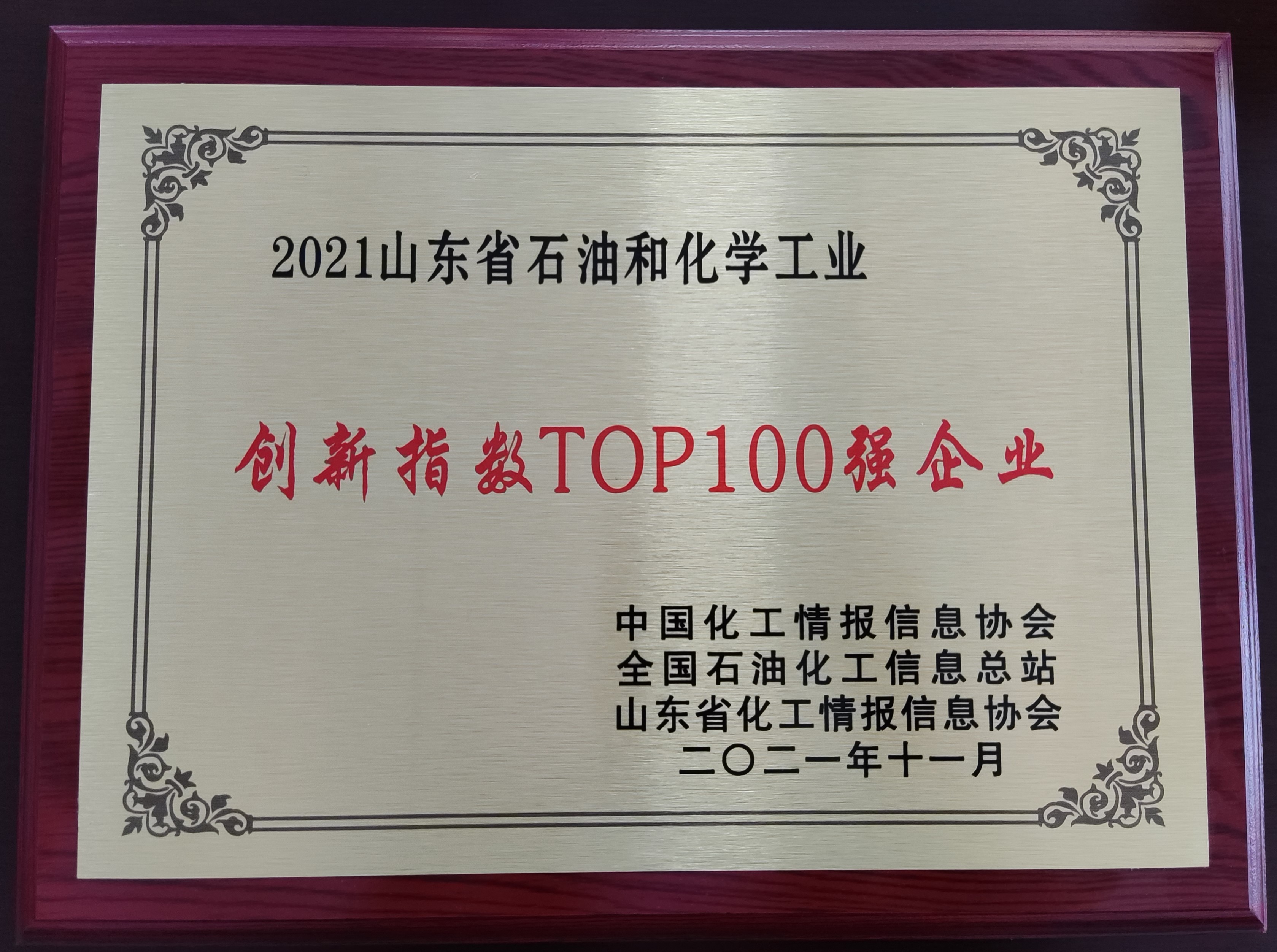 11月23日至24日,由山東省化工情報(bào)信息協(xié)會(huì)主辦的2021(第十一屆)中國(guó)化工產(chǎn)學(xué)研高峰論壇在東營(yíng)廣饒召開。論壇峰會(huì)舉行了“2021化工年度精英人物暨明星單位”頒獎(jiǎng)盛典,發(fā)布了“2021山東省石油和化學(xué)工業(yè)創(chuàng)新指數(shù)top100企業(yè)”榜單。集團(tuán)公司榮獲“2021山東省石油和化學(xué)工業(yè)創(chuàng)新指數(shù)top100企業(yè)”稱號(hào)。